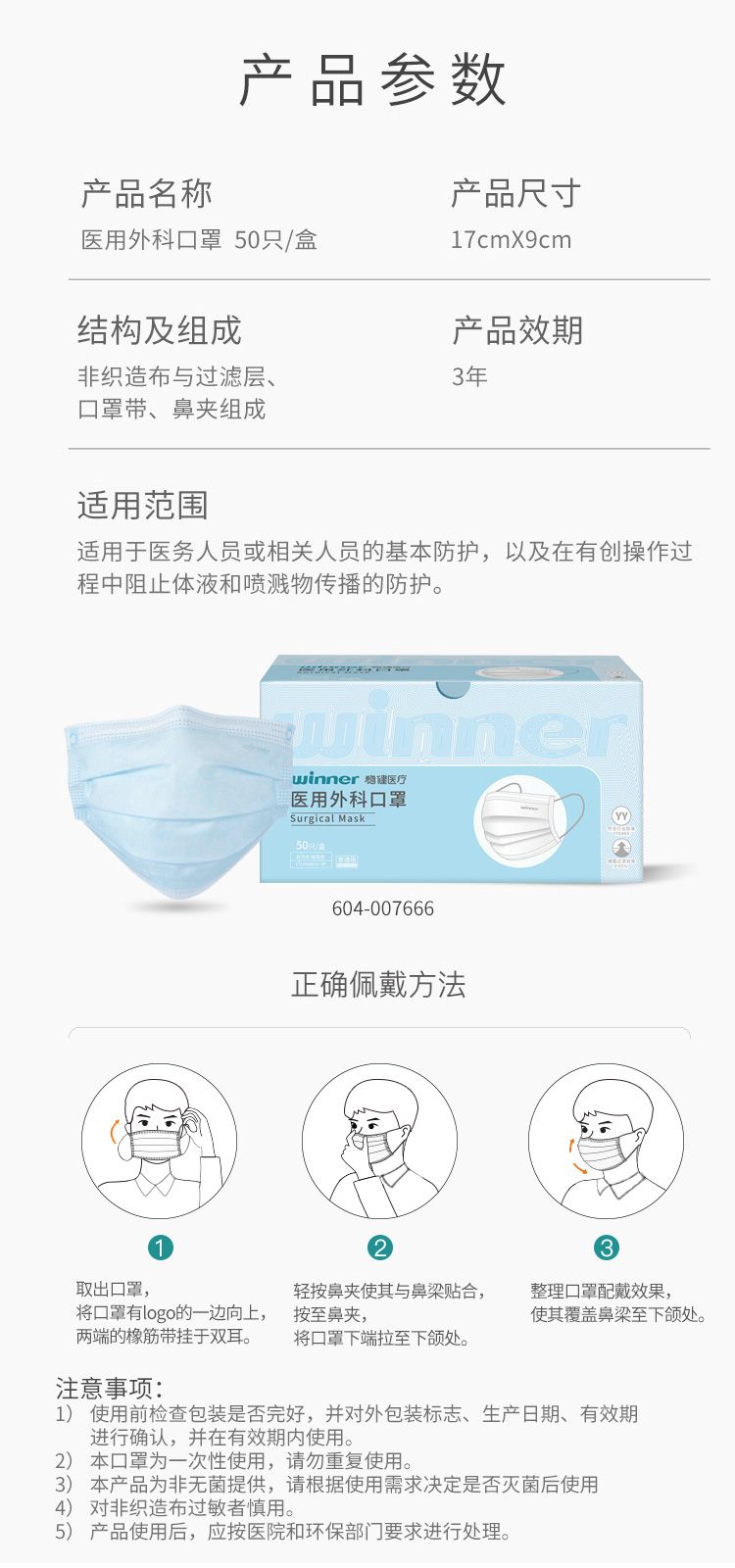 稳健(Winner)医用外科口罩50只/盒 夏季轻薄透气三层防护含熔喷层防花粉细菌过滤率大于95% 抽取式盒装